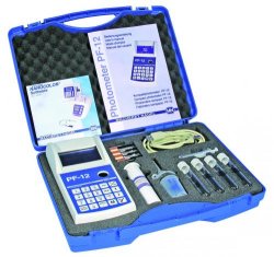 Przenośny fotometr PF-12 do laboratorjów, w komplecie z instrukcją obsługi, ładowarką do baterii i baterią akumulatorową.