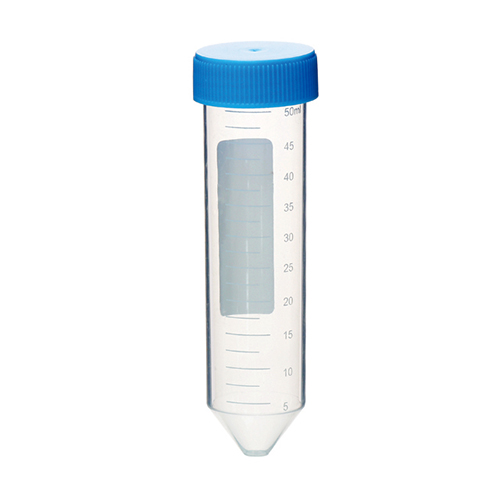 Probówka PP 50ml (30x115mm) stożkowodenna skalowana, stojąca z polem do opisu z niebieską nakrętką (50szt)