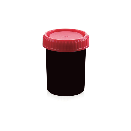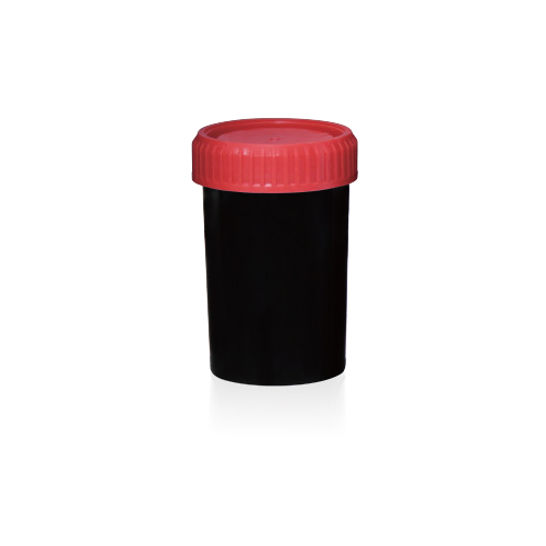 Pojemnik PP 100ml czarny na kał, z czerwoną nakrętka i łopatką do światłoczułych próbek, pakowany indywidualnie, niejałowy